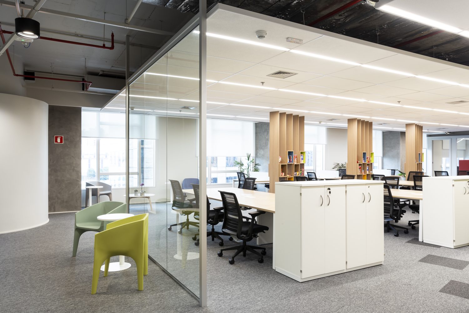 Ambientes planejados reduzem o estresse e oferecem mais conforto. Divisórias de ambiente podem incluir isolamento acústico e iluminação adequada, proporcionando equilíbrio entre privacidade e colaboração.