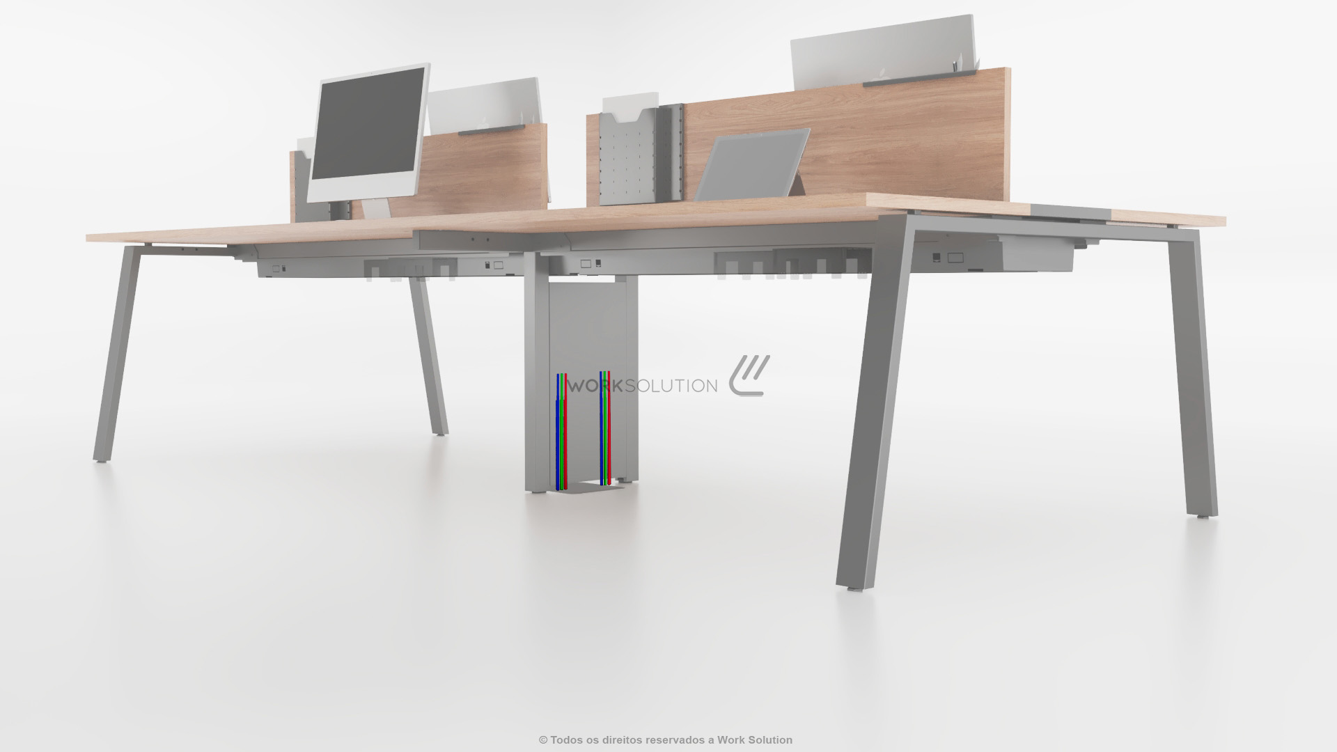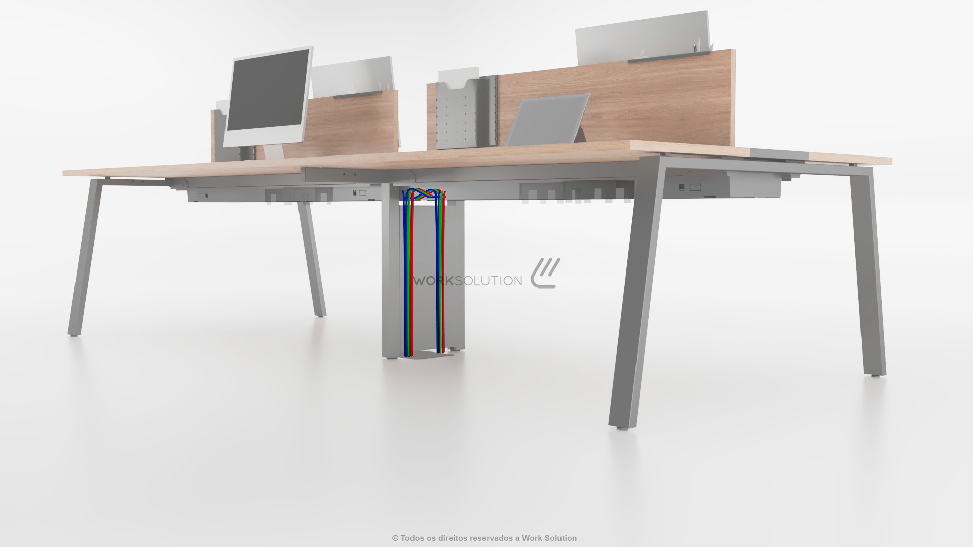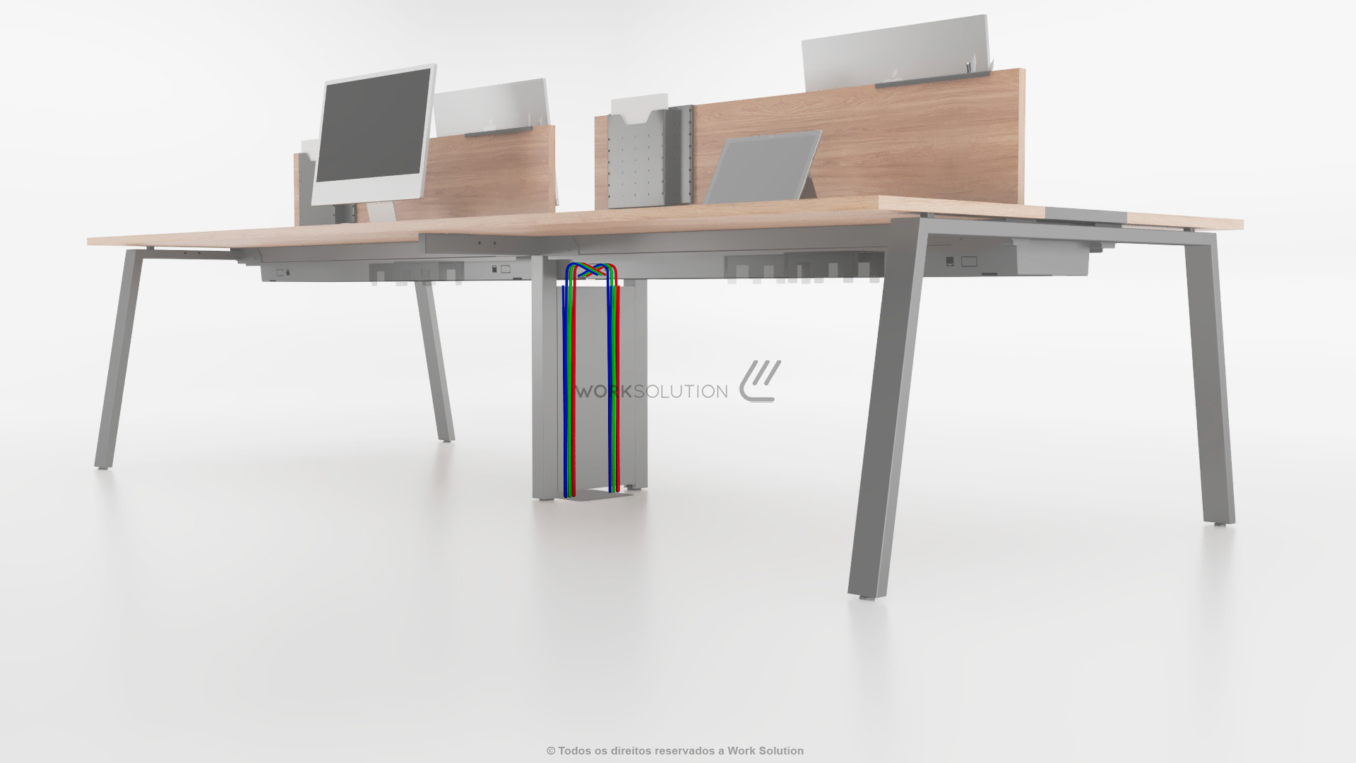 Simule o funcionamento scrollando o botão do mouse.Nesse caso, o acesso do cabeamento até a caixa de conectividade é via shaft central.Dependendo do modelo da mesa, o acesso do cabeamento pode ser via vértebra