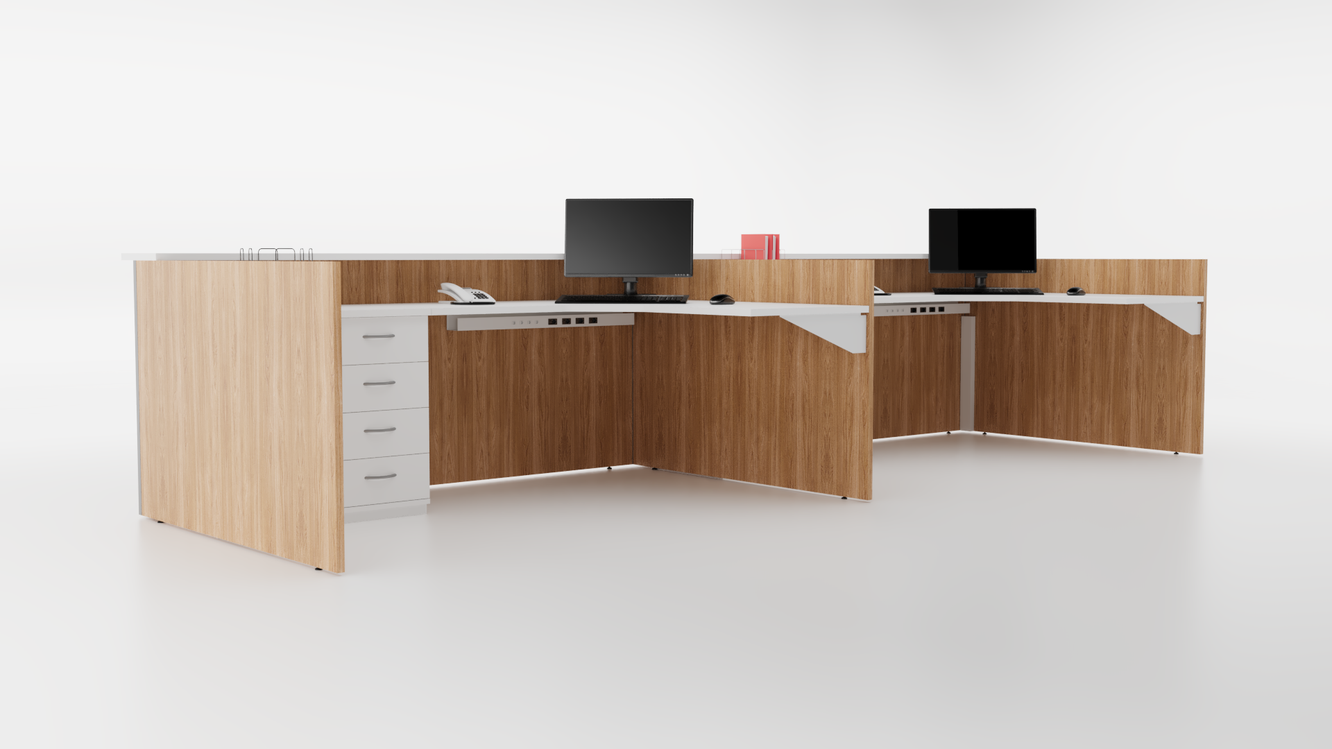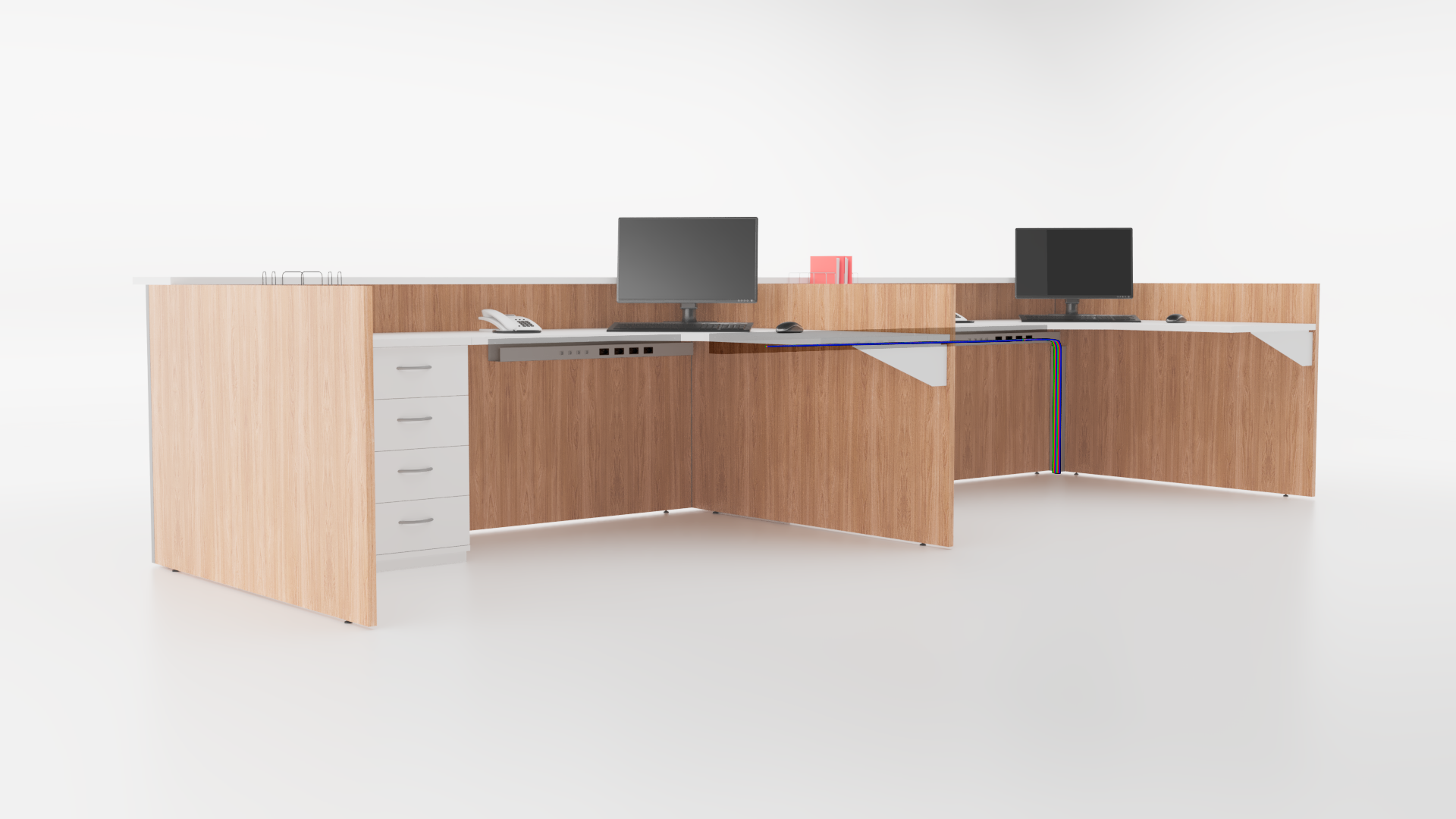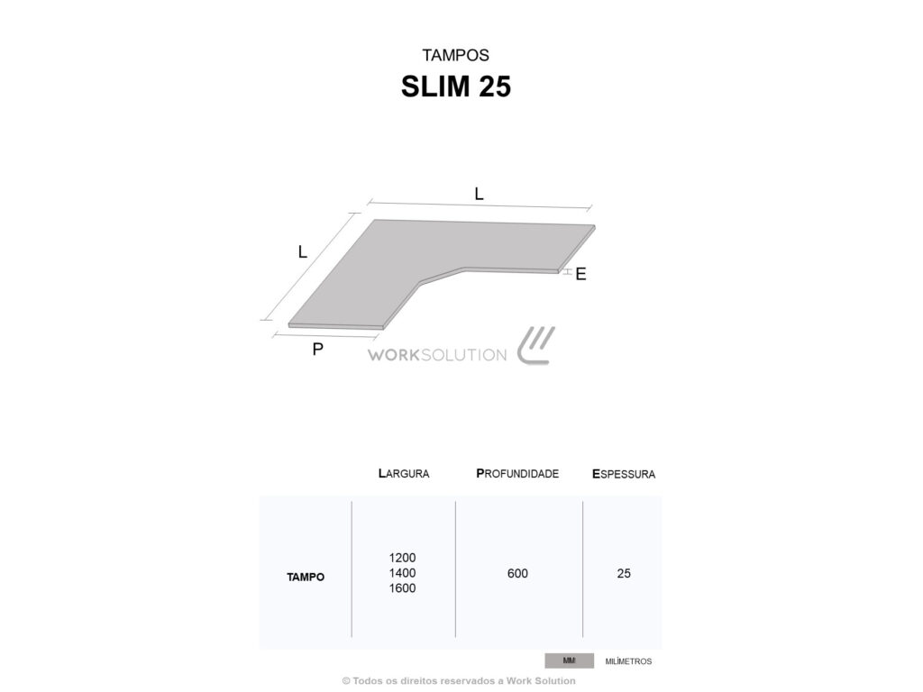 O cabeamento da linha Slim 25 é direcionado para a caixa de conectividade por meio de uma calha vertical, podendo ser distribuída para as demais posições de trabalho através da calha horizontal.Dependendo do modelo da mesa, o acesso do cabeamento pode ser via vértebra