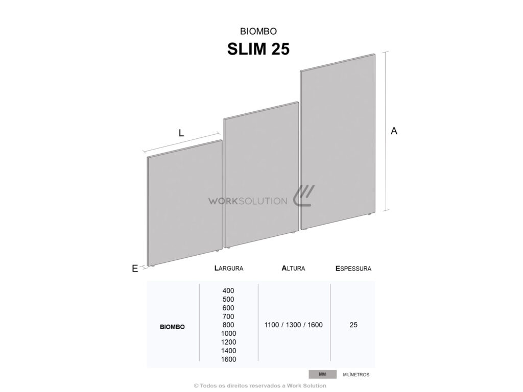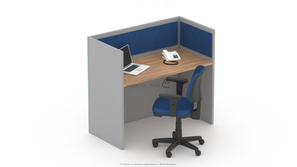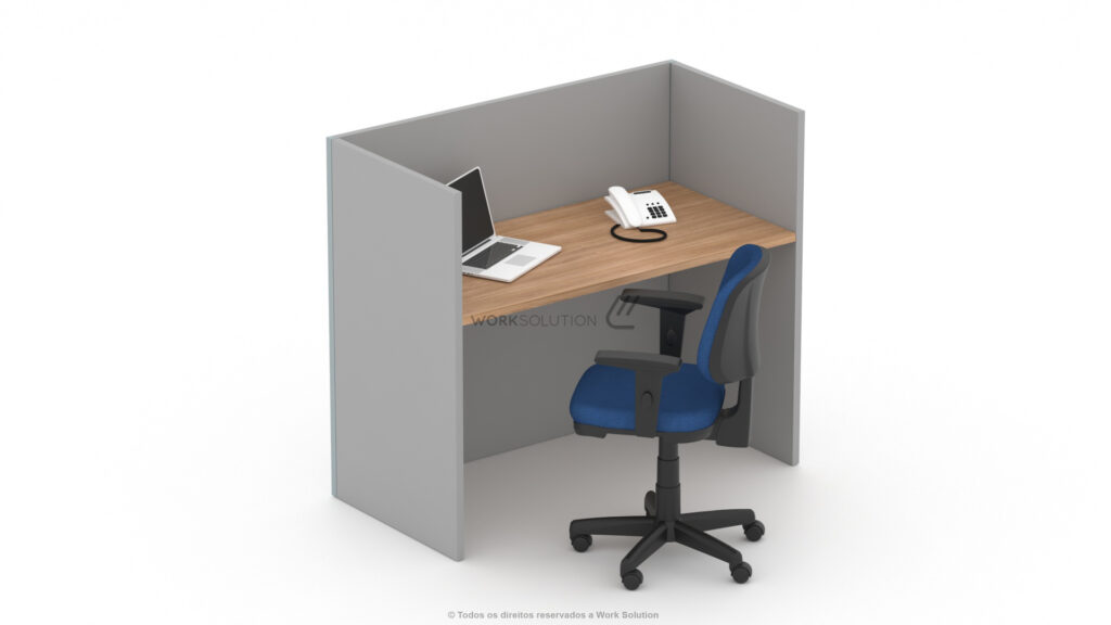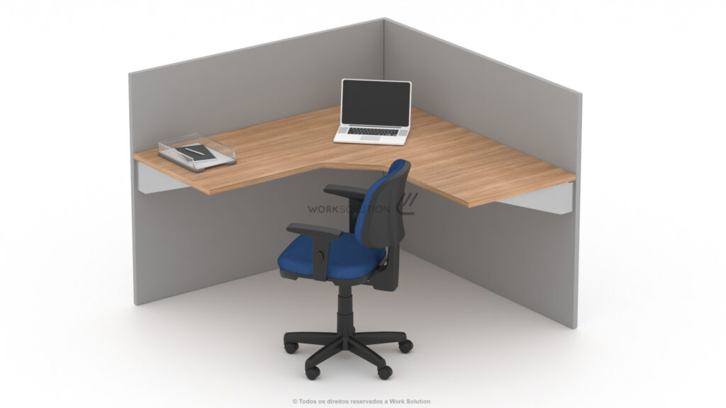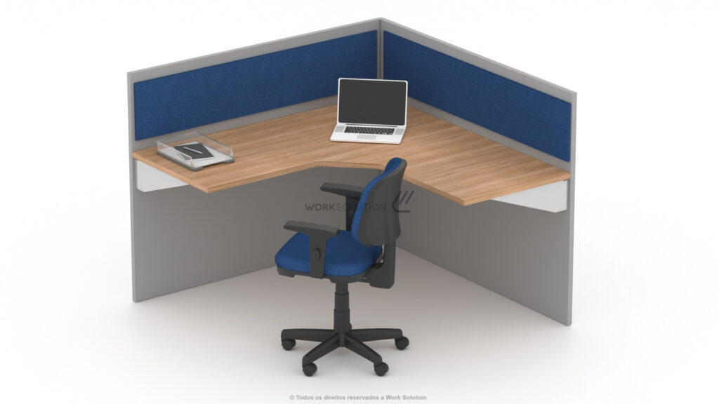 Tampos versáteis em formatos retangulares e angulares que oferecem diversas opções de layout, além de biombos de diferentes alturas que proporcionam flexibilidade e privacidade no ambiente.