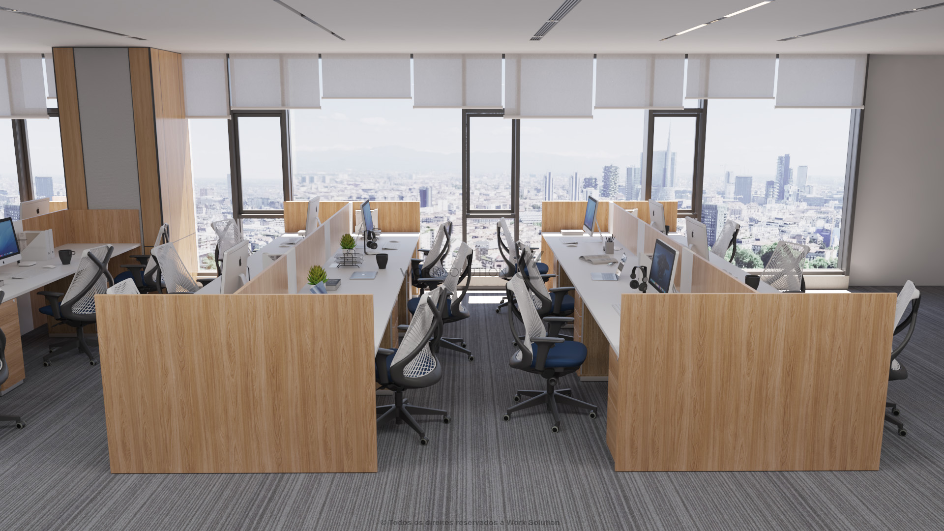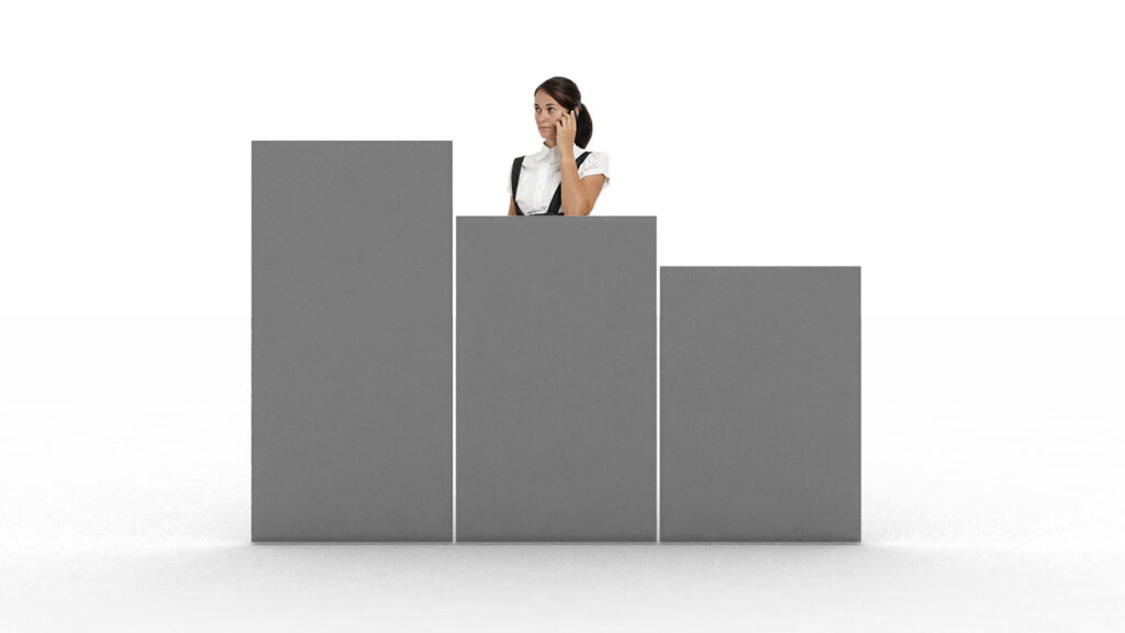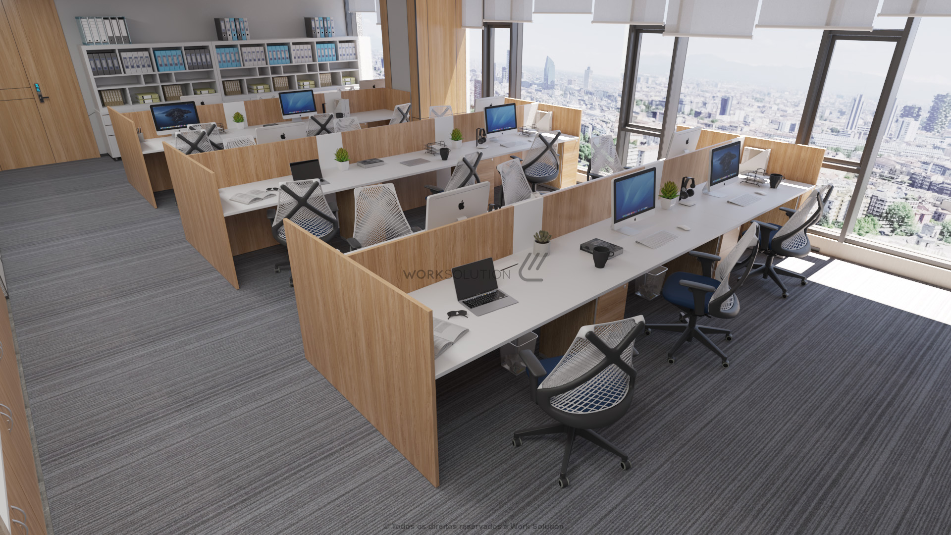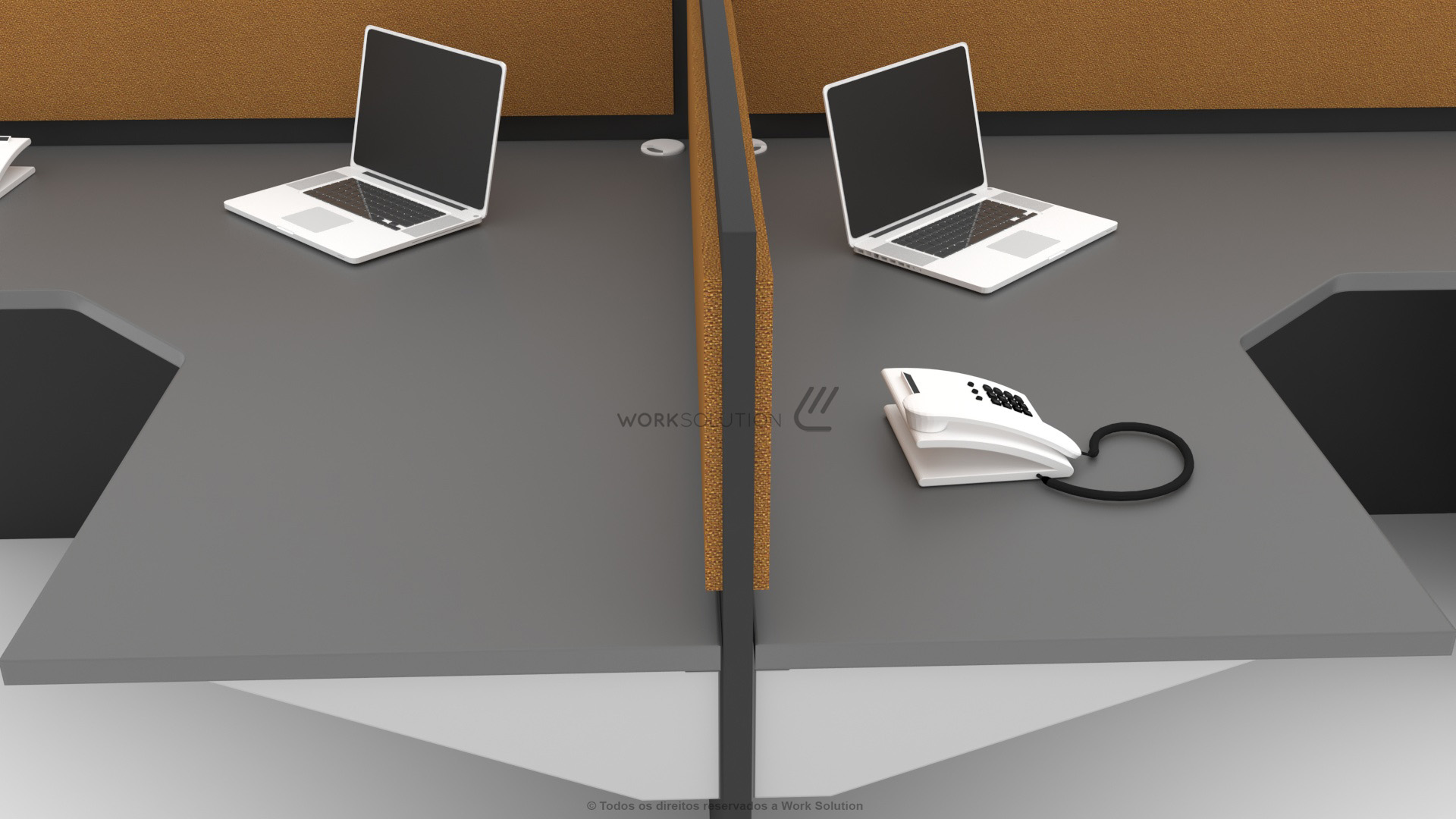 Tampos versáteis em formatos retangulares e angulares que oferecem diversas opções de layout, além de biombos de diferentes alturas que proporcionam flexibilidade e privacidade no ambiente.